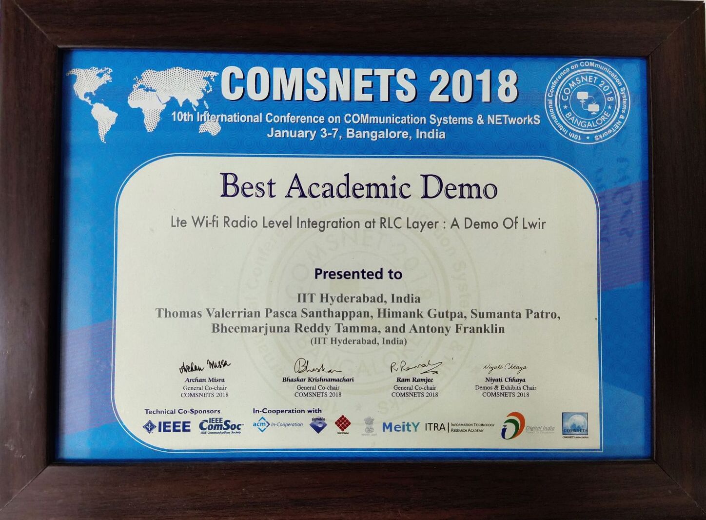 The paper โLTE Wi-Fi Radio Level Integration at RLC Layer: A Demo of LWIRโ co-authored by Thomas Valerrian Pasca S, Himank Gupta, Sumanta Patro, Bheemarjuna Reddy Tamma, and Antony Franklin A was given the Best Academic Demo Award at COMSNETS 2018.